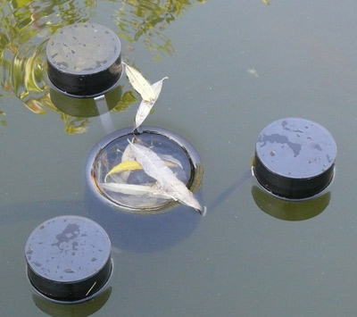 Der Skimmer ist nun aufgebaut und die Anlage kann in Betrieb genommen werden. Sie sehen wir die Blätter angesaugt werden. Diese bleiben dann im Skimmerkorb. Die Pumpe selber dürfen die Blätter natürlich nicht erreichen, da sonst die Pumpenkammer verstopfen würde. Eine Teichpumpe hat nämlich nicht so viel Kraft wie ein Häcksler. Sie können den Korb dann aus dem Aufsatz entnehmen und ausleeren. Der Blütenstaub usw. wird natürlich schon durch die Pumpe in den Filter transportiert. Wenn der Skimmeraufsatz zu oft aufsteigen würde, können Sie diesen mit dem mitgeliefertem Zubehör des Aufsatzes durch Steine etwas einschweren damit er leichter unter Wasser gezogen wird. Das muss man aber dann an Ort und stelle austesten. Je nach Situation kann man den Skimmeraufsatz dann anpassen.